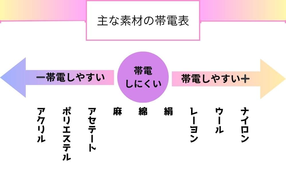 衣類は様々な種類の素材でできていますが、素材によってプラスの電気を帯びやすいものと、マイナスの電気を帯びやすいものとがあります。